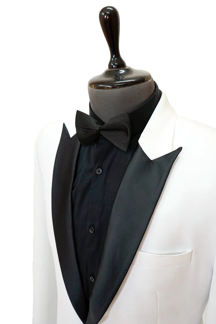 Elevate your formal ensemble with our Classic White 2-Piece Tuxedo featuring a sleek black peak lapel. Crafted for timeless sophistication, this ensemble exudes elegance and refinement. Perfect for weddings, galas, and special occasions, it's the epitome of distinguished style.