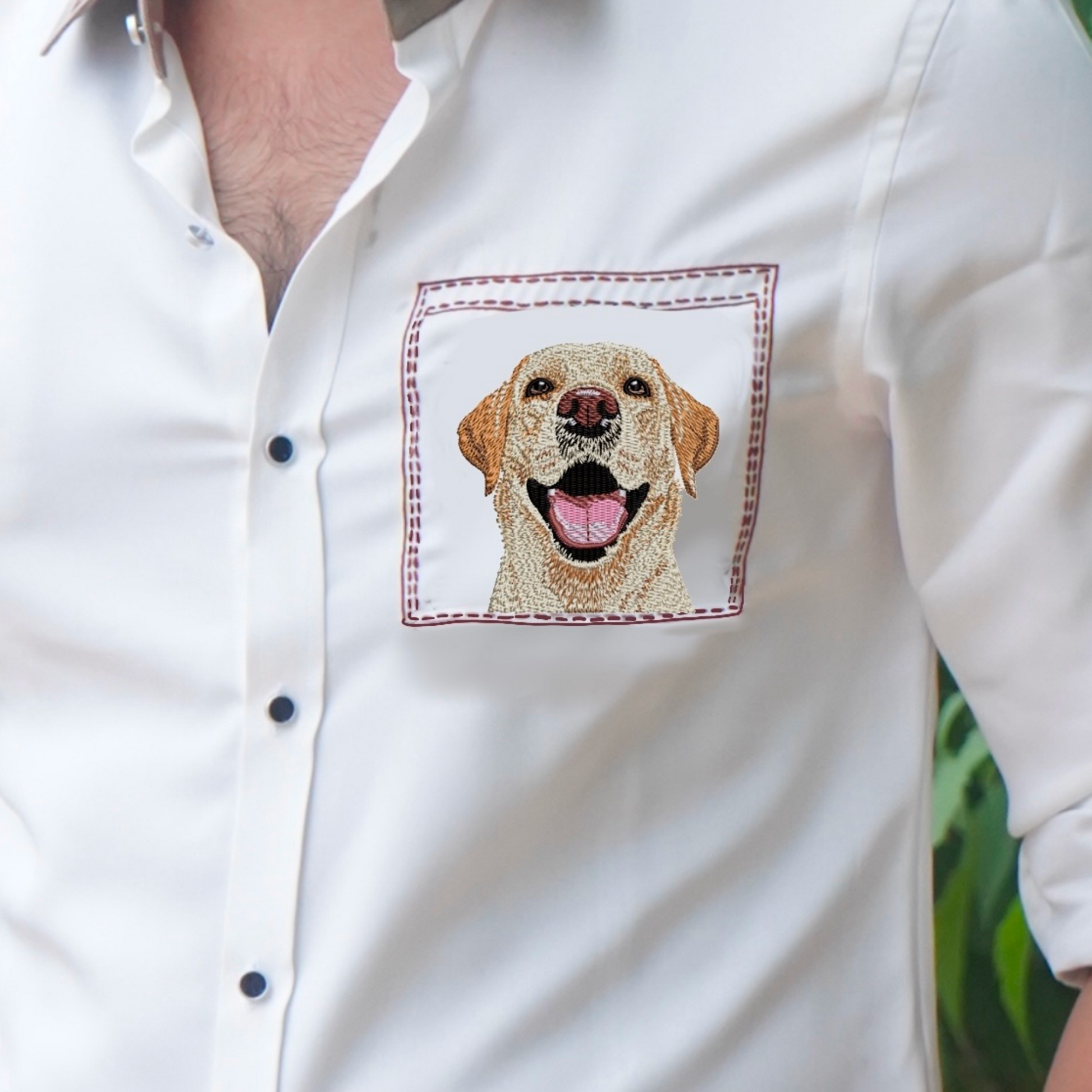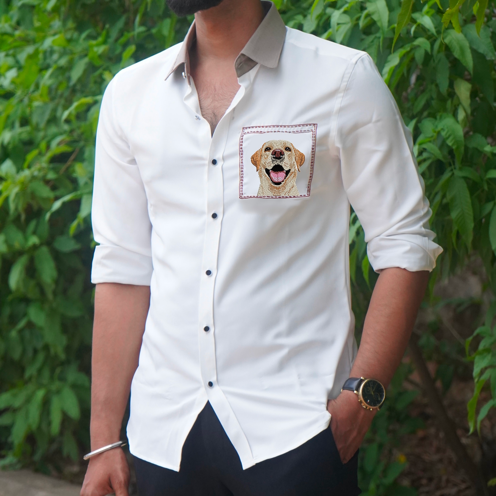 Elevate your wardrobe with this refined white shirt, tailored from lightweight wool crepe for a structured yet breathable feel. The chest pocket area features an expressive dog motif brought to life through a blend of hand embroidery and hand painting — a tribute to loyalty and character. Contrasted with ash grey cuffs and collar, and finished with designer black buttons, this full-sleeve shirt strikes the perfect balance between sophistication and artistic edge.