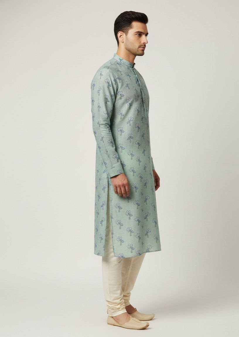 This elegant, knee-length kurta is crafted in a serene sage green hue, featuring a refined self-textured fabric with subtle vertical stripes. It is adorned with a delicate, all-over floral sprig print in muted blue tones, offering a perfect blend of traditional charm and modern sophistication.